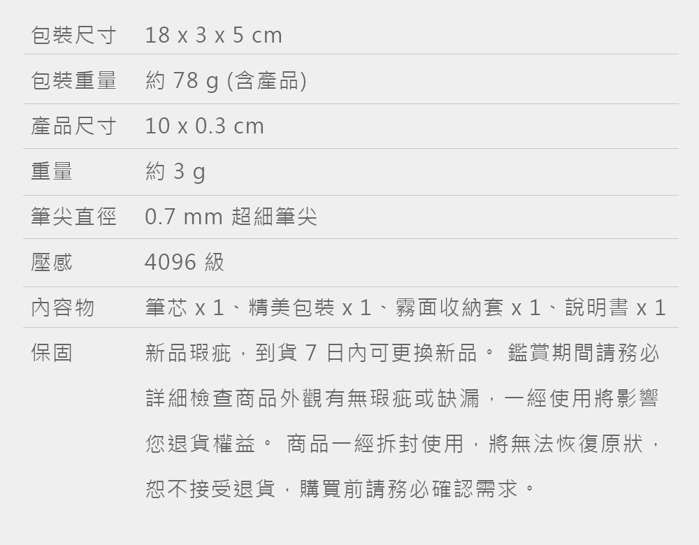 1. 本電磁筆採用高硬度筆尖,僅適用於 Supernote 電子筆記本 FeelWrite 軟膜的螢幕表面。 2. 陶瓷筆尖尖銳易碎,請勿用力戳碰其他的物體或產品。 3. 書寫完畢後,請記得蓋上筆蓋或者按壓筆尾以縮進筆尖,防止筆尖損壞。 4. 請遠離強磁、強靜電環境,以免損壞電磁筆。 5. 電磁筆無防水功能,請勿與水或其他異體接觸。 6. 請勿摔砸本產品,以免零件脫落或是損壞。 |