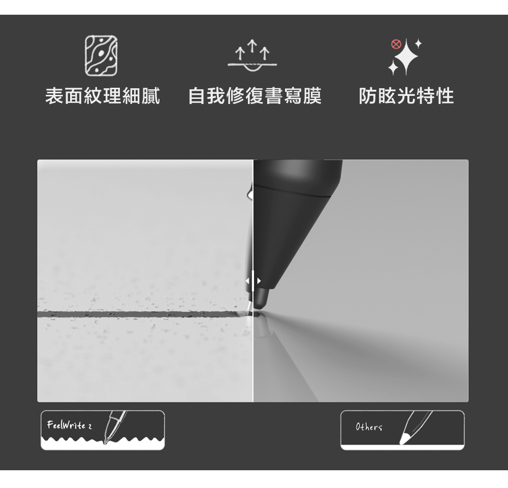 獨家 FeelWrite 2 自我修復柔軟膜,搭配陶瓷 NeverReplace 筆尖,長時間書寫依然細膩穩定。